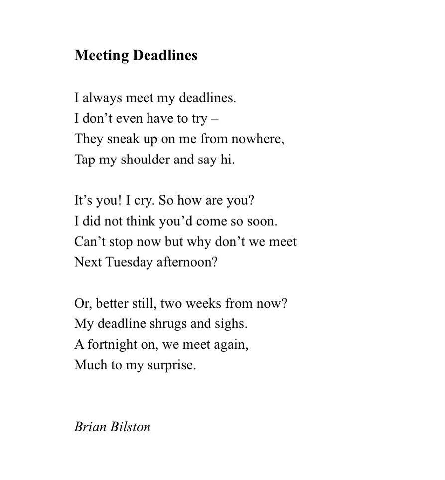 Brian Bilston is an English poet known mostly to me as someone who publishes funny little poems on social media, but who is actually a traditionally published novelist and poet of 3 collections. Below are two of his poems, selected for their humor and relatability. His other works can be found here.